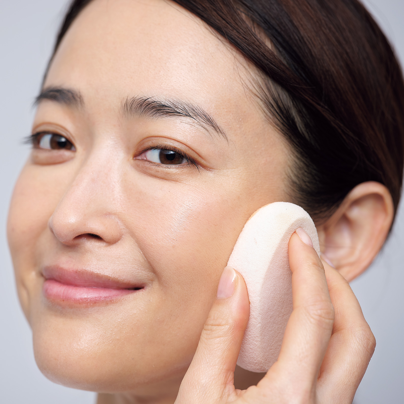半顔量は米粒大よりさらに少なめ。顔の中央から薄く伸ばしたら、フェイスラインはスポンジで馴染ませれば、厚塗りにも見えません。ファンデの力を信じ、使用量を守ることがうるおい感に直結。
