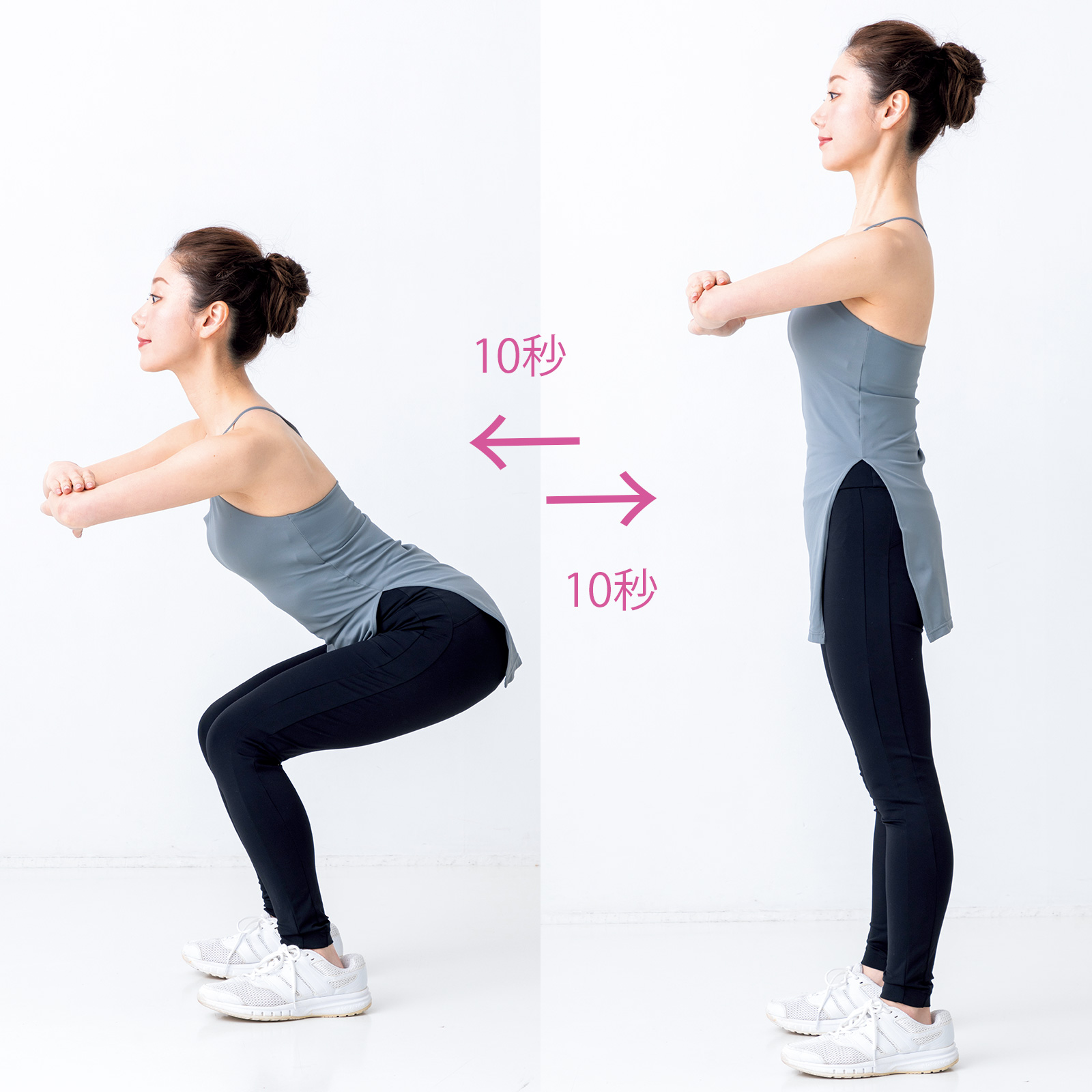 腰が完全に落ちた時に膝の角度が90度に近くなるようにスクワット運動を。ポイントは10秒で腰を落とし、10秒で上がるゆっくりペースで行うこと。スクワットは3~5回繰り返す程度で決して無理をしないで。慣れてきたら徐々に回数を増やしてトレーニングを重ねてみましょう。