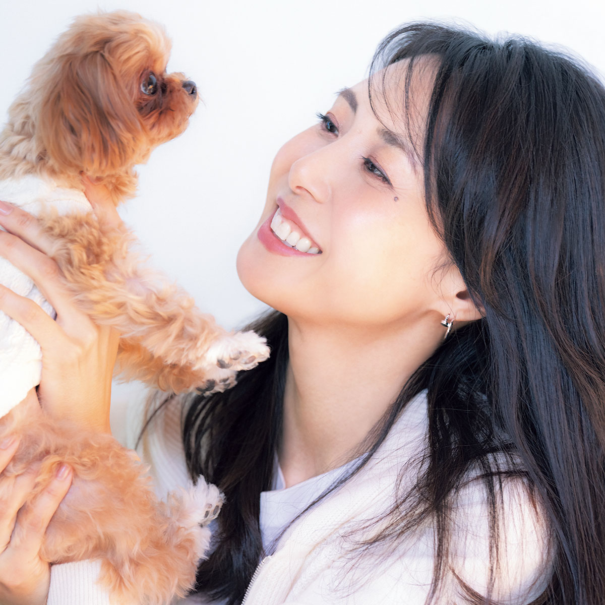年齢を経ると、爆笑するくらい笑ったり、大声を出すことが少なくなってきますよね。40代の頃は率先して絶叫マシンに乗って、キャーッと大声出していこう、なんて思ってました。でも50代は激しい乗り物に乗ってめまいがしたり、首が痛くなったら困ります(笑)。それよりは自分の気持ちに素直になって、優しい笑顔を作ることを心がけています。今日も真っ青な晴天でとても気持ちが良くて、あー、風が心地いい、太陽が降り注いで気持ちいい、と身近にある気持ちよさを感じることで自然と撮影でも笑顔になれました。