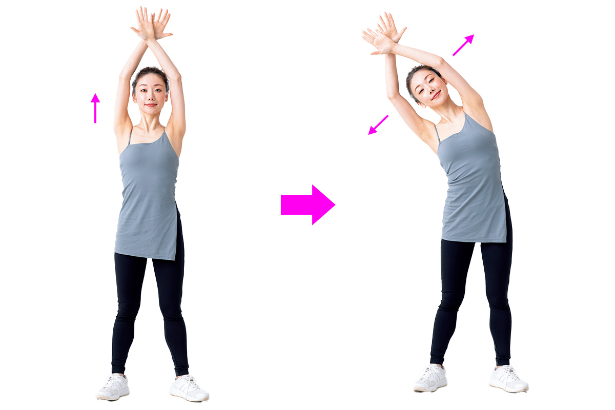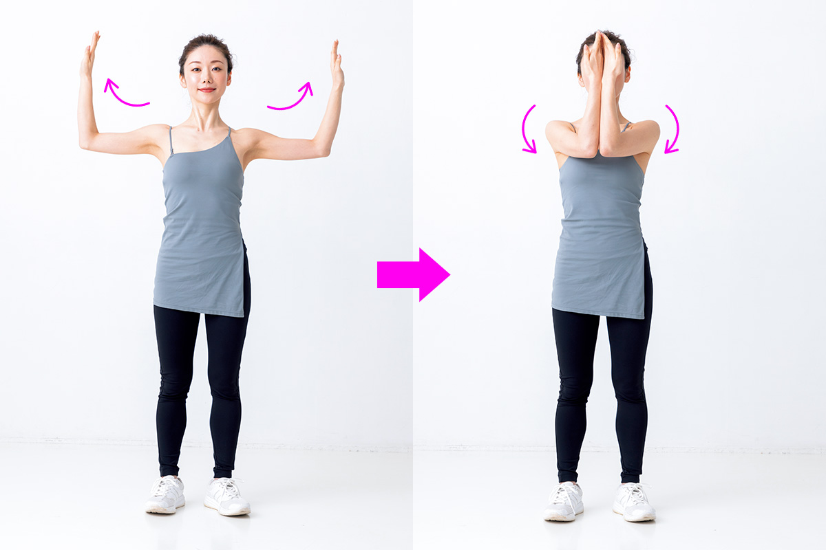 1.足を肩幅に開いて立ち、両腕を頭上に伸ばして手のひらは前向き、手首を交差。