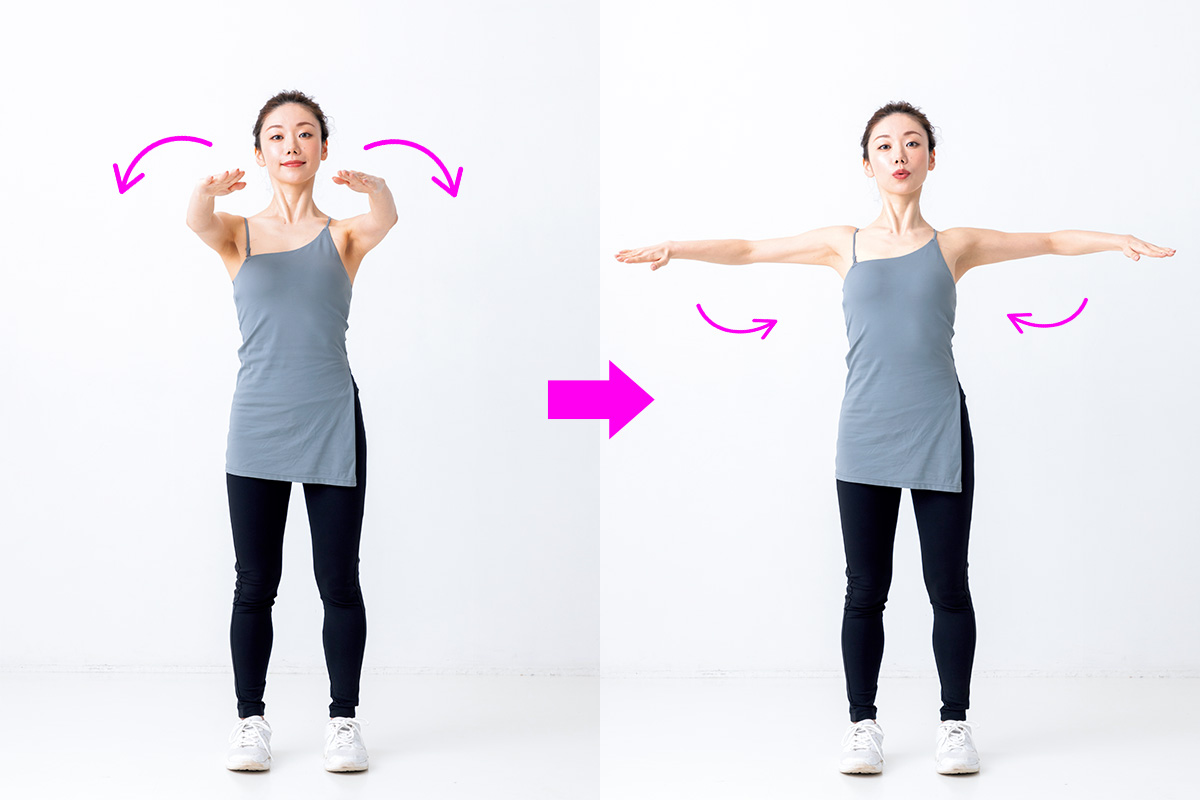 1.足は肩幅に開いて立ち、背筋を伸ばして息を鼻から吸いながら手のひらを外側へ向けて両腕を開く(肘は90度)。