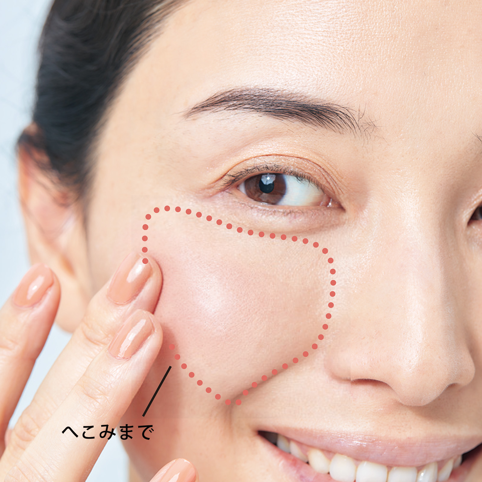 肌がくすんでいたり顔色が悪く見えるとせっかくの笑顔もパッとしない印象に。そんな時は〝幸せほっぺメイク〟で笑顔をアシストしましょう。仕込みと仕上げで重ね塗りした「ミルフィーユチーク」が血色を作る鍵。今回は橋本マナミさんがメイクにチャレンジしてくれました。
