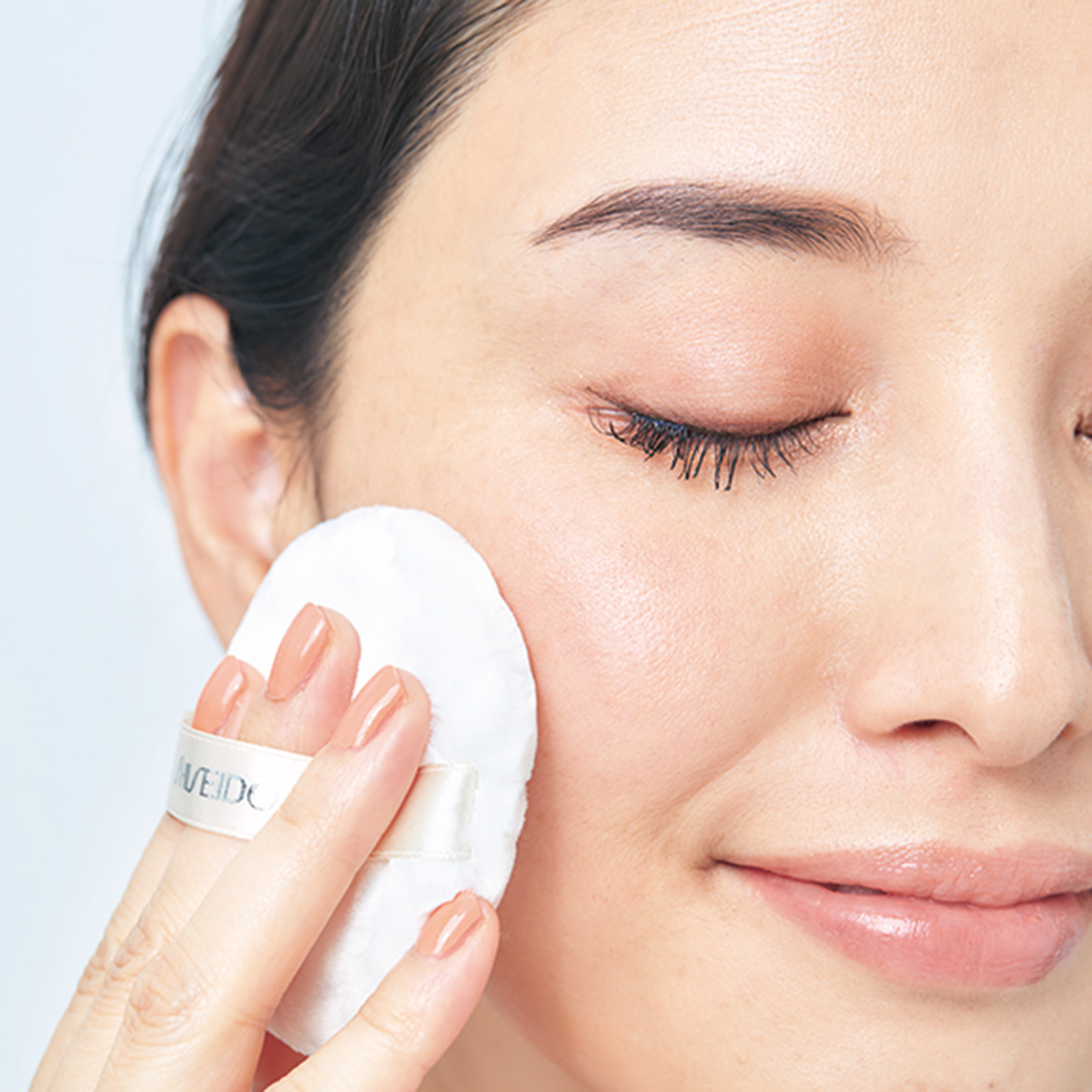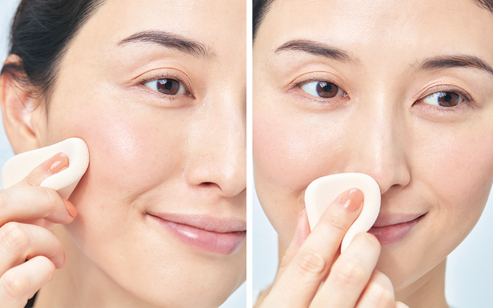 頰に伸ばしたチークは境目をボカし、スポン ジで淡く馴染ませます。残りを鼻先と顎先 にもポンポンとのせると上気したような肌に。