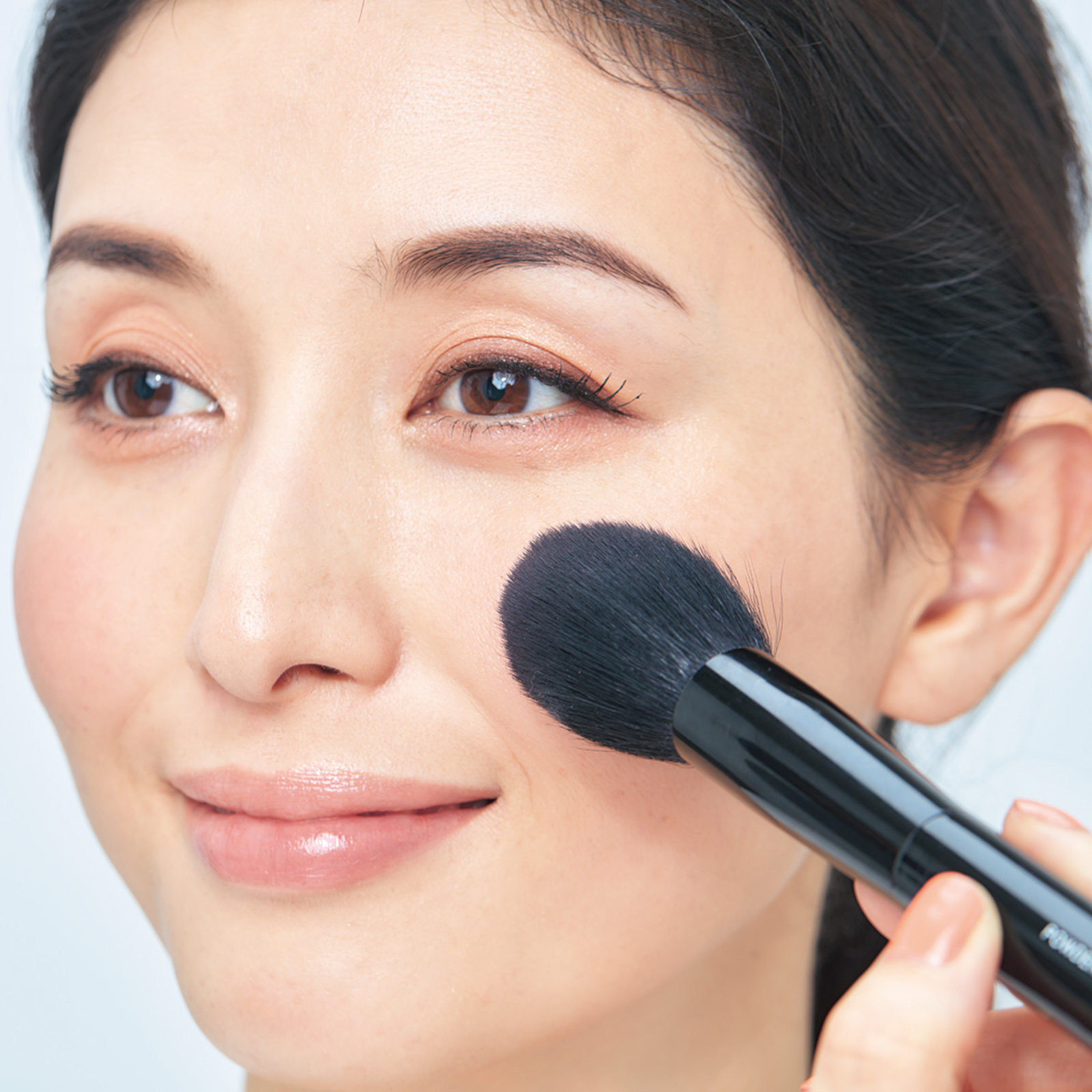 メイクを仕上げてルースパウダーをのせたらパウダーチークを。ブラシに取り、手の甲で余分な粉をオフしてから頰の高い位置に丸く塗って、ほわっと発色。