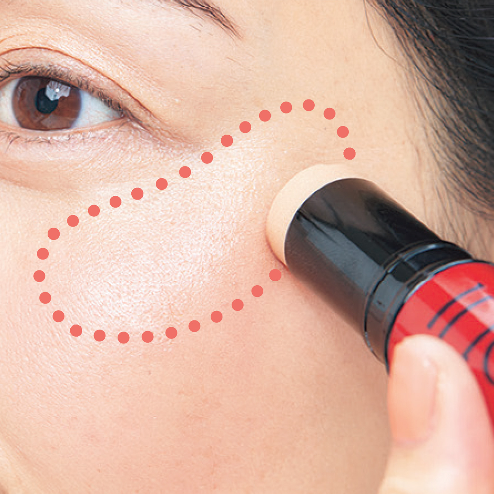浮かずに馴染ませるにはファンデと一緒に仕込むテクを。ファンデを全体に塗ったら、練りチークを指の腹に取り、同量のファンデと手の甲で混ぜます。頰中央にトントン置いたら、へこんだ部分からははみ出さない範囲に広く淡くボカします。