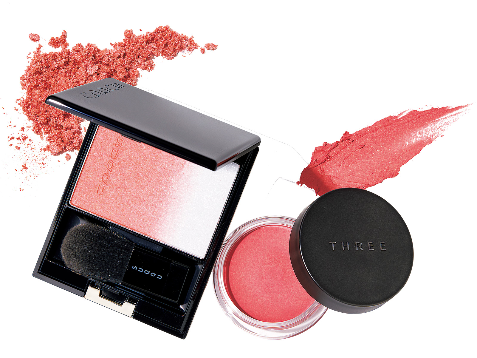 練りもパウダーも選ぶべき色は、ヘルシーなオーラを強化するコーラルピンク。左・血色ピンクとピンクパール入りのハイライトが、肌に馴染んで透明感を引き出す。SUQQU ピュア カラー ブラッシュ 146 ¥6,050 ※ 1/26 限定発売(SUQQU)右・ワックス、オイル、パウダーをバランスよく配合し、軽くてクリーミーな質感で薄膜にフィット。目元や唇にも使えるマルチアイテム。THREE グラムトーンカラーカスタード 01¥3,300(THREE)