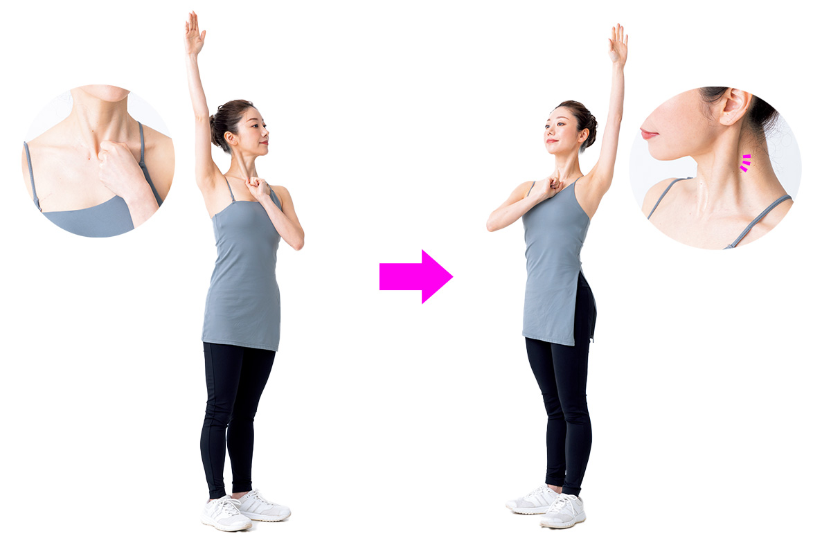 1.まっすぐに立ち左の胸鎖乳突筋の起点の胸鎖関節、左鎖骨の最も中心側のグリグリ付近を右手こぶしで軽くたたく。