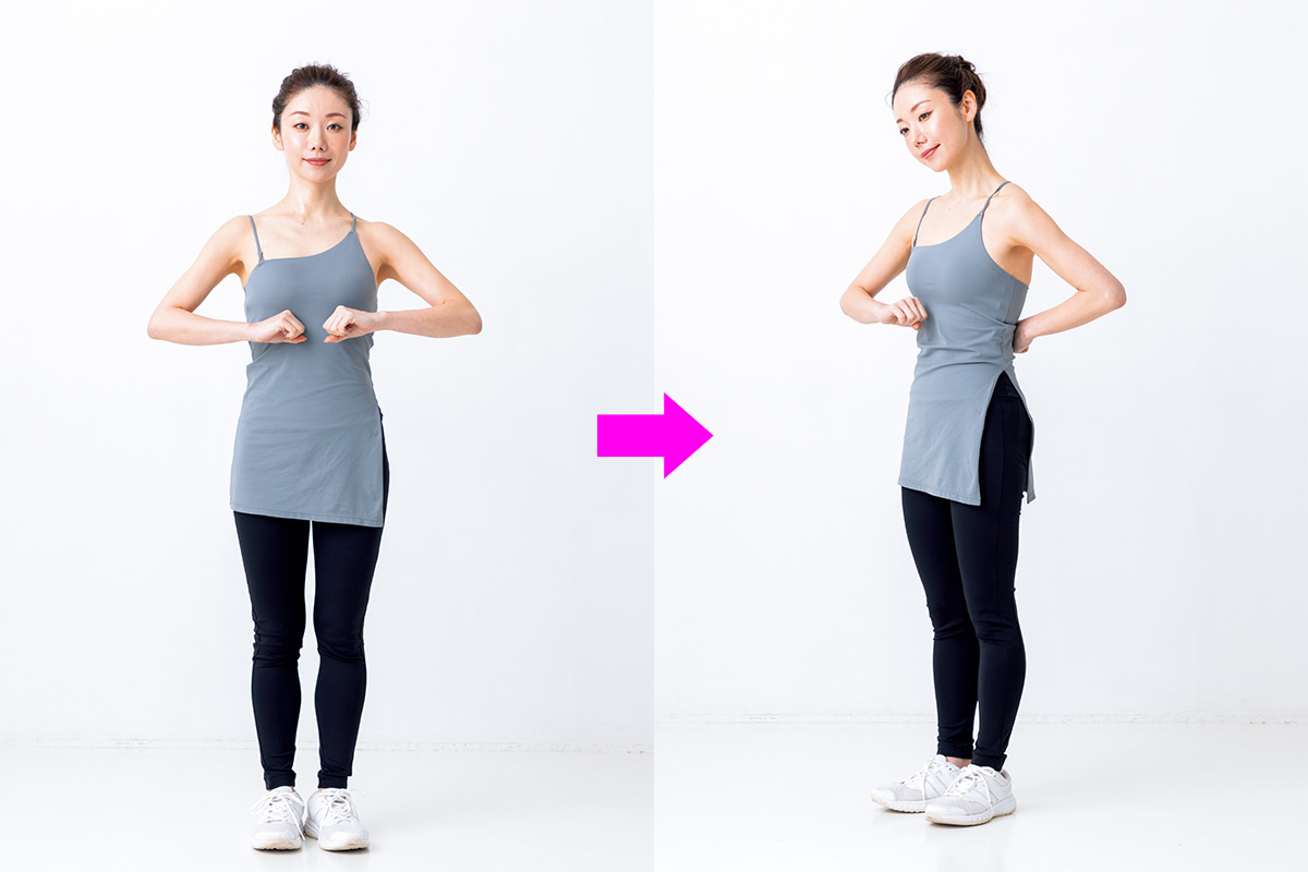 1.背筋を伸ばして立ち、軽く手を握って拳を作り胸のまわりをトントンとたたく。
