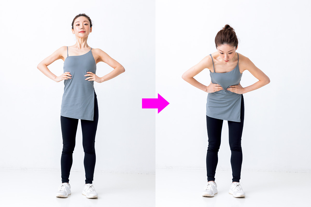 1.足は肩幅に開いてまっすぐ立ち、胸の下の左右の肋骨付近を両手でつかんで、やや上体をそらしながら鼻から息を吸う。