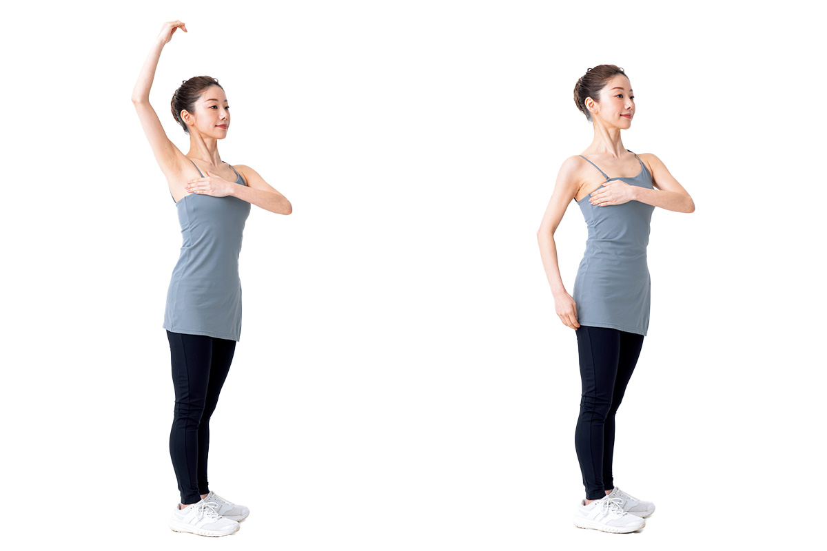 1.背筋を伸ばして立ち、右腕を上げ左手で右の脇の下付近の前鋸筋を優しくつかむようにマッサージ。腕を上げずに楽な位置に下ろして行ってもOK。
