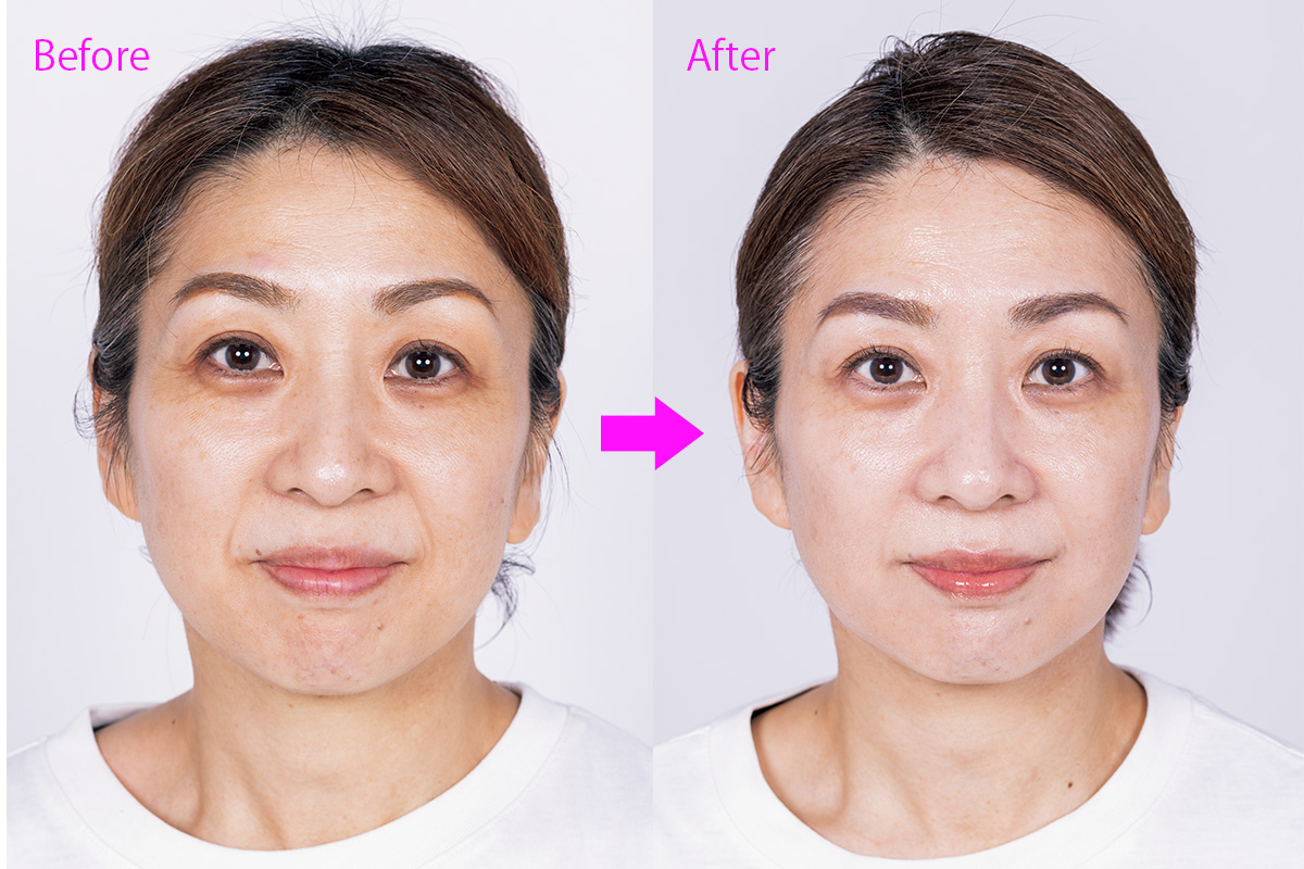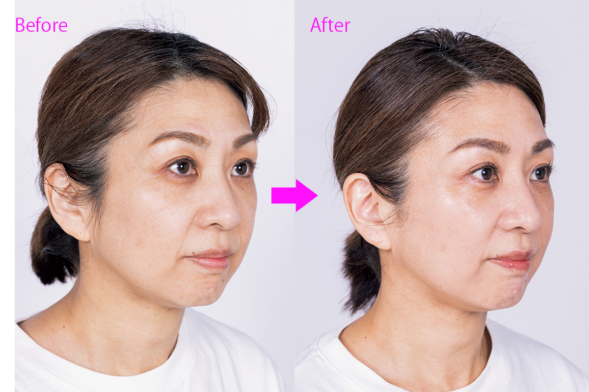 顔全体のくすみが払拭され、高いところに光が集まり艶めく肌に。目尻の小ジワやほうれい線もふわっと目立たなく。フェイスラインがキュッと引き締まり上向きの肌印象に変化。