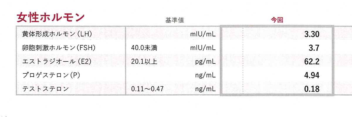 エストロゲン(E2)の分泌が減少し、ゴナドトロピン(FSH、LH)の上昇が見られたら卵巣機能が低下の場合も。ホルモン値の把握は大事。