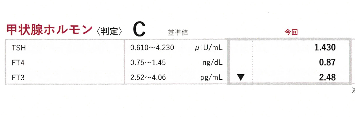 FT3またはFT4が低下し、TSHが上昇しているときに甲状腺機能低下症と判断。更年期症状と似ているため、区別するためにも血液検査が必須。