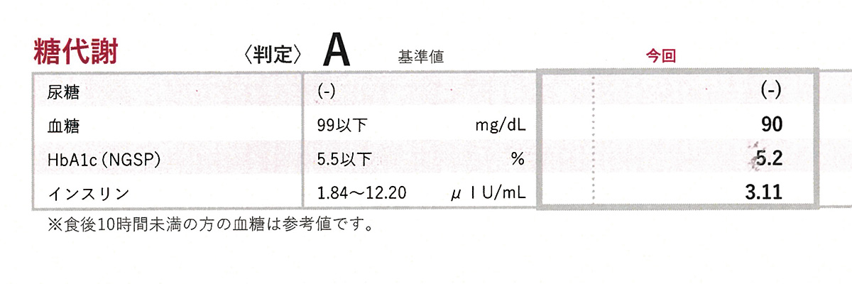 糖代謝の測定は空腹時血糖が90mg/dL程度とHbA1c5.5%未満であれば正常。糖代謝の異常は腎障害・神経障害・目の障害に繋がります。