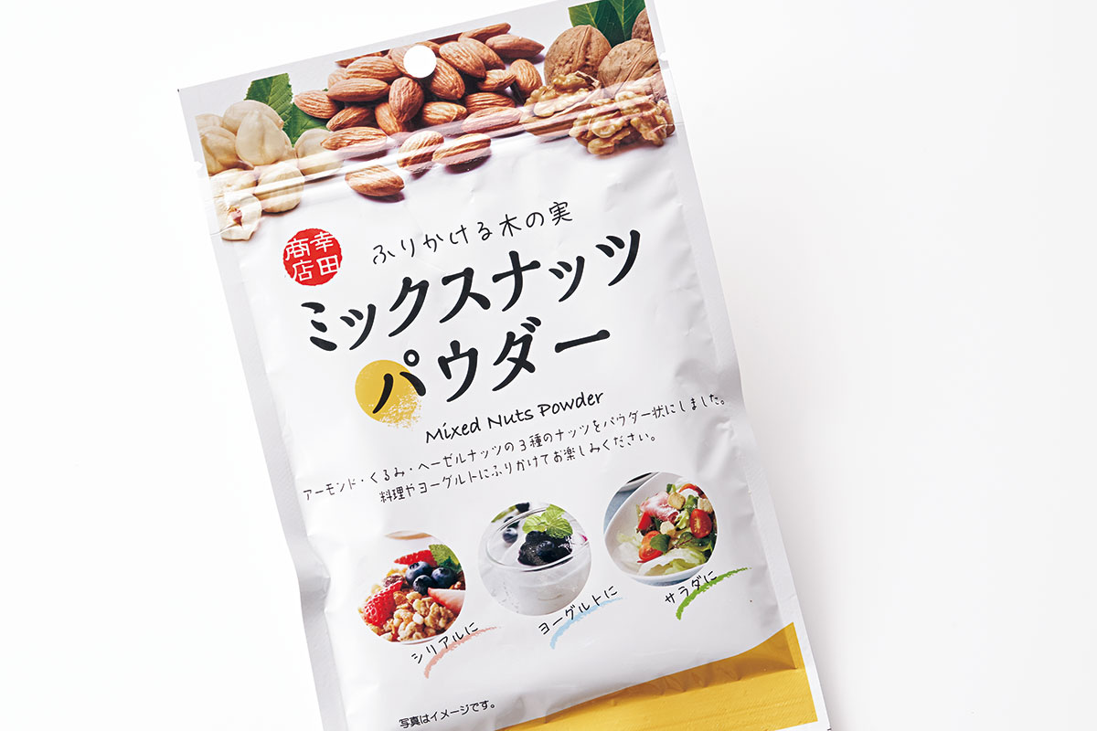 オメガ3、オメガ6、オメガ9の不飽和脂肪酸やビタミンEが含まれる3種のナッツがパウダーに。ミックスナッツパウダー50g ¥210(幸田商店)
