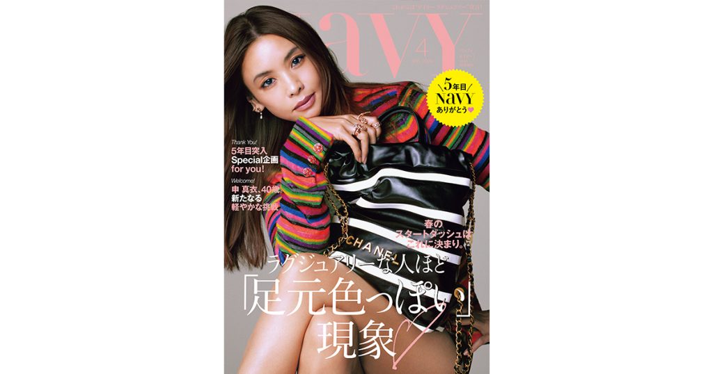 「NaVYがスタートして、この4月号でなんと5年目に突入だそうです。早い?長い?いや本当に早かった。あっという間でしたね。 コロナ禍の始まりと同時期のスタートでしたが、今思えばリラックス感のあるファッションも楽しいかも!と気づけるきっかけになりました。その反動か、この春はレディライクな着こなしにもひかれていますが、今そう思えるのもまた、その気づきがあったからなのかもしれません。日常とファッションはやはり切り離せないものですね。NaVYの今月号はシューズの大特集。私自身も足元でファッションのバランスを取ることが多いので、シーズン初めに必ずチェック。今の自分に必要な1足は……そんな目線で今号を楽しみたいと思います。」(滝沢さん)