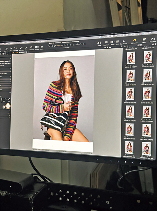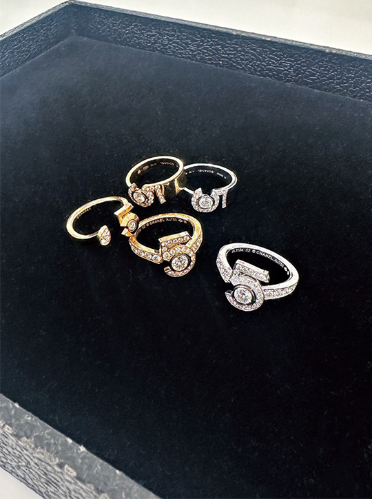 5年目突入のアニバーサリーだから、「シャネル N̊5」のジュエリーで撮影する!がテーマのひとつでした。“5”の向きやダイヤモンドの入り方などさまざまなデザインバリエが大集合!