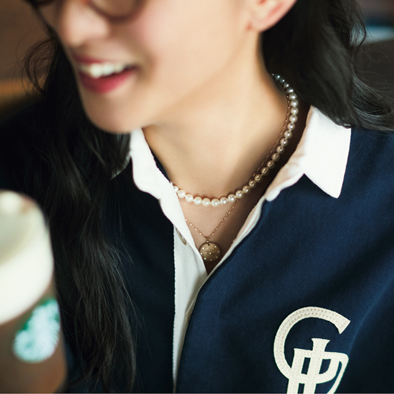 シャツ¥12,100(スピック&スパン/スピック&スパンルミネ有楽町店)パンツ¥53,900(エブール/エブール GINZA SIX店)バッグ¥165,000(J&M デヴィッドソン/J&M デヴィッドソン カスタマーセンター)パールネックレス¥96,800 リング¥176,000(ともにジジ/ホワイトオフィス)ネックレス〈チェーン〉¥24,200〈チャーム〉¥74,800(ともにエネイ/ショールーム リンクス)眼鏡(スタイリスト私物)
