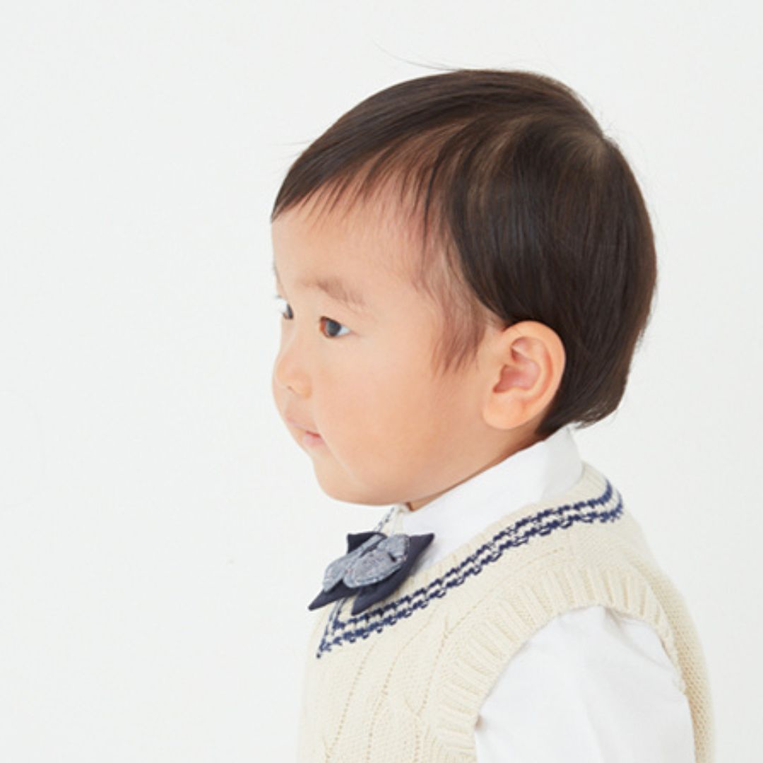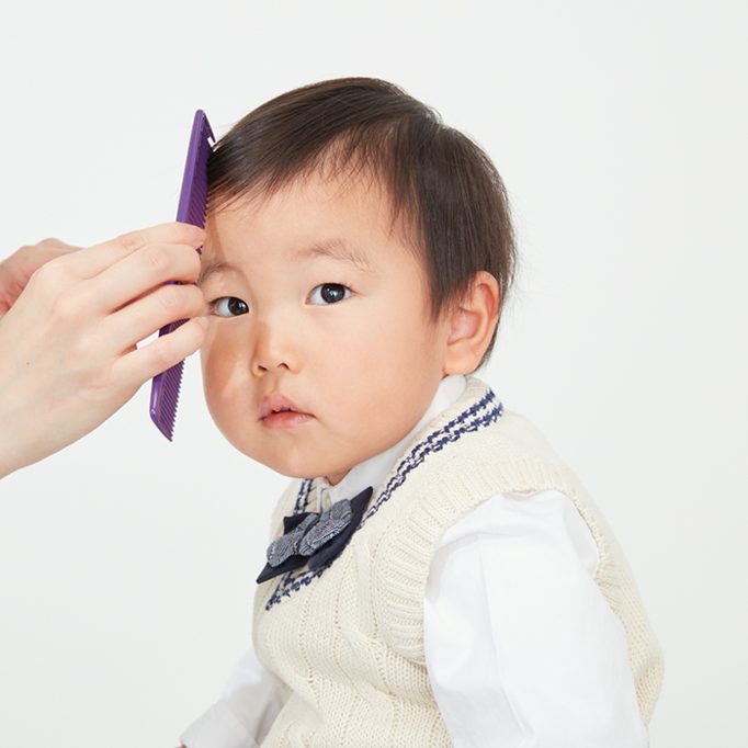 卒入園式はシャツと蝶ネクタイでカッコよく。服装に合わせて髪を整えるなら、赤ちゃんでも使えるスキンケアオイルを使うのがおすすめです。七三スタイルはかっこいいですが、無理に分け目をつけるのはNG。毛量が少ない子どもは、余計ペッタリと見えてしまいます。サイドパートを意識しつつ、その子の毛流れに合わせて分けてあげるとナチュラルな仕上がりに。毛先にオイルをつけてウェットな質感に整えると、いつもと違う雰囲気になります。