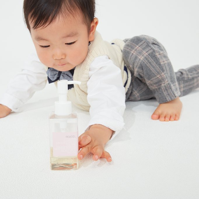 スタイリング剤は、赤ちゃんの肌にも安心して使えるスキンケアオイル「ルーオイル」(ハーハ)を使用。