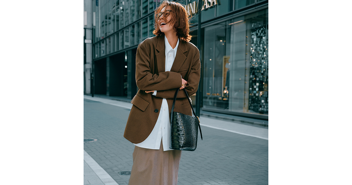 スカート¥28,600(サクラ/インターリブ)シャツ¥46,200(ローエ/エスケーパーズオンライン)ジャケット¥49,500(ザ ハンサム/UTS PR)バッグ¥148,500(J&M デヴィッドソン/J&M デヴィッドソン カスタマーセンター)パンプス¥36,300(ピッピシック/ベイジュ)眼鏡¥38,170(オリバーピープルズ/ルックスオティカジャパン カスタマーサービス)リング¥16,500(アビステ)靴下¥1,430(ホイサム)