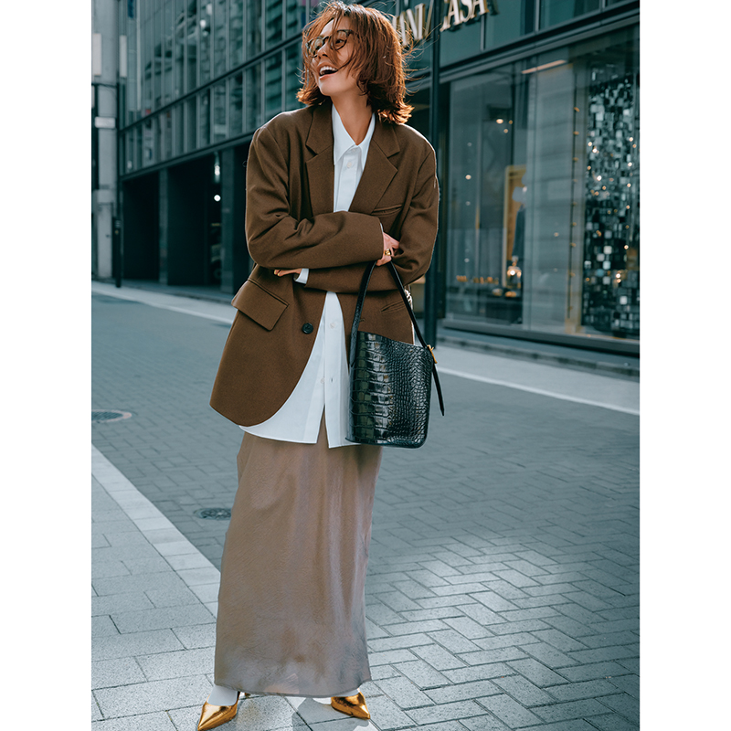 ハンサムなシャツ×ジャケットにフェミニンな艶感サテン、両極の取り合わせが洒落て見える!