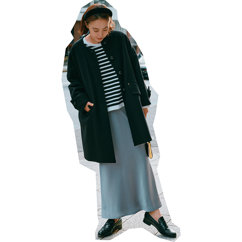 スカート¥39,600(サードマガジン)ボーダートップス¥38,500(ザ・ニューハウス/アーク インク)コート¥145,200(マッキントッシュ/マルティニーク ルミネ横浜)バッグ¥141,900(チノ×ザンケッティ/モールド)ローファー¥16,390(ア ドゥ ヴィーヴル)ヘッドバンド¥42,900(アレクサンドル ドゥ パリ/アレクサンドル ドゥ パリ GINZA SIX店)
