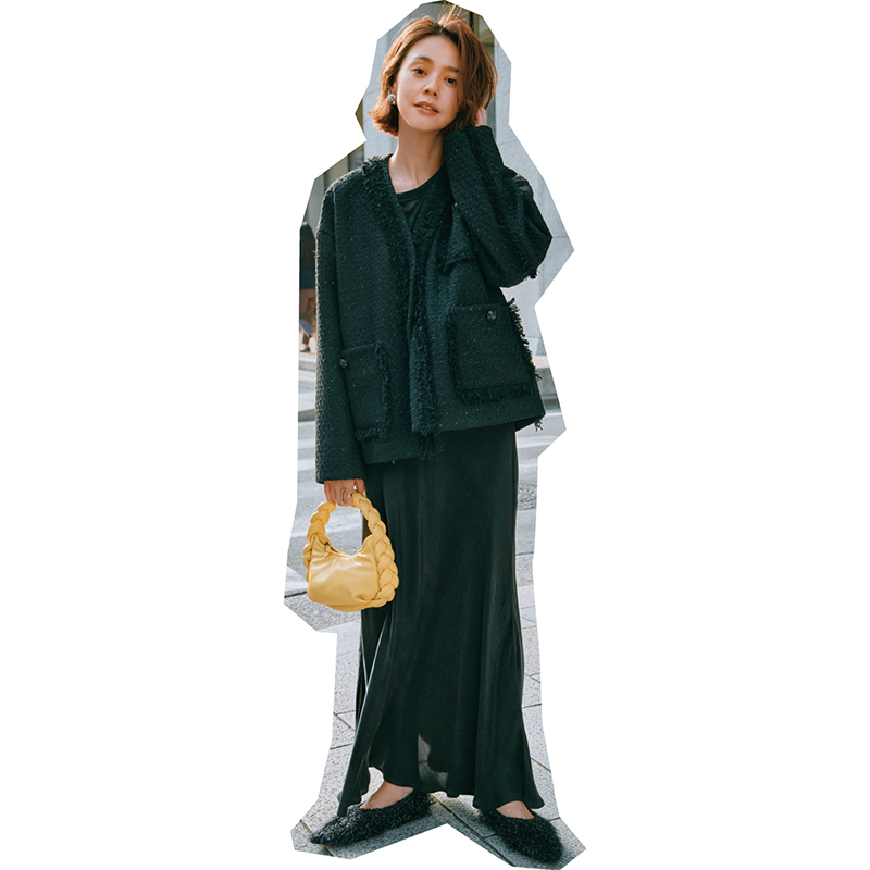 重さを感じないオールブラック、そのコツは素材のミックスにあり。ツイードジャケットにつるんとサテン、同色でも異なる素材を重ねることで単調とは無縁、センスフルなスタイルに。