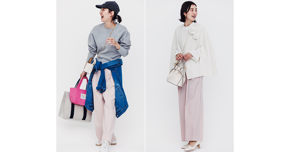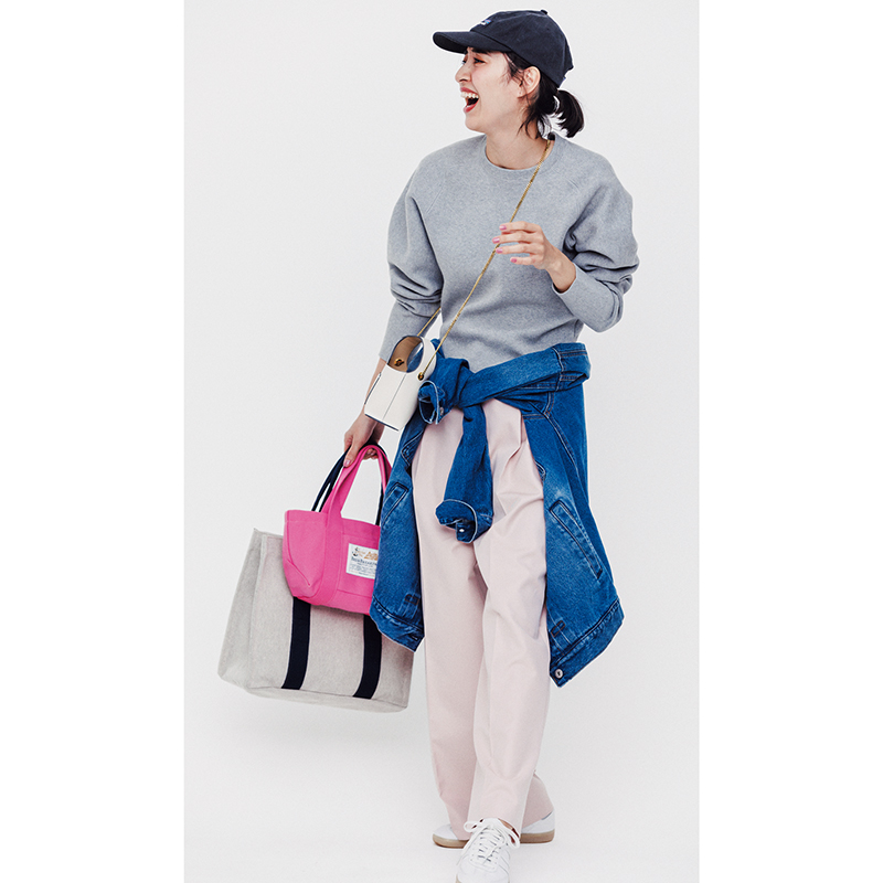 パンツ¥17,930(アンクレイヴ スタンダード/アンクレイヴ〈オンワード樫山〉)ニット¥24,200(アルアバイル)腰に巻いたジャケット¥19,800(アルページュストーリー)斜めがけしたバッグ¥28,600(トーヴ/トゥモローランド)ミニバッグ¥11,000(ベッド&ブレックファスト/グリードインターナショナルトウキョウストア)トートバッグ¥37,950(フランソワ レニエ/ヤマニ)スニーカー、キャップ/スタイリスト私物