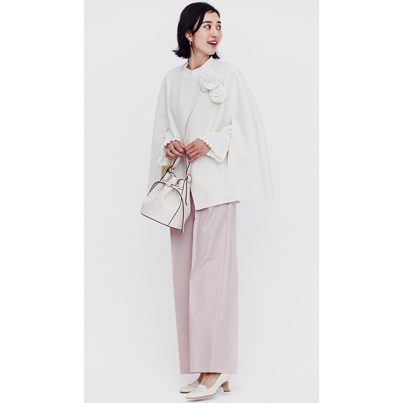 ロイヤルな雰囲気漂うケープ、プリーツ袖や同素材のコサージュで細部まで華やかに仕上げて。