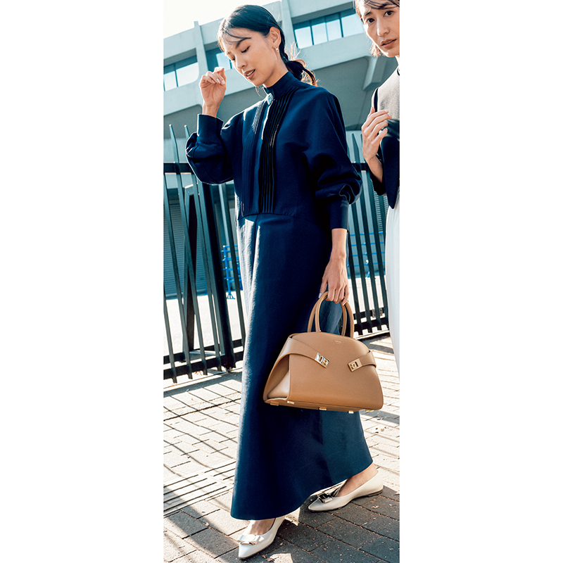 ワンピース¥118,800(ハルノブムラタ/ザ・ウォール ショールーム)ピアス¥534,600(TASAKI)バッグ¥363,000 パンプス¥121,000(ともにフェラガモ/フェラガモ・ジャパン)