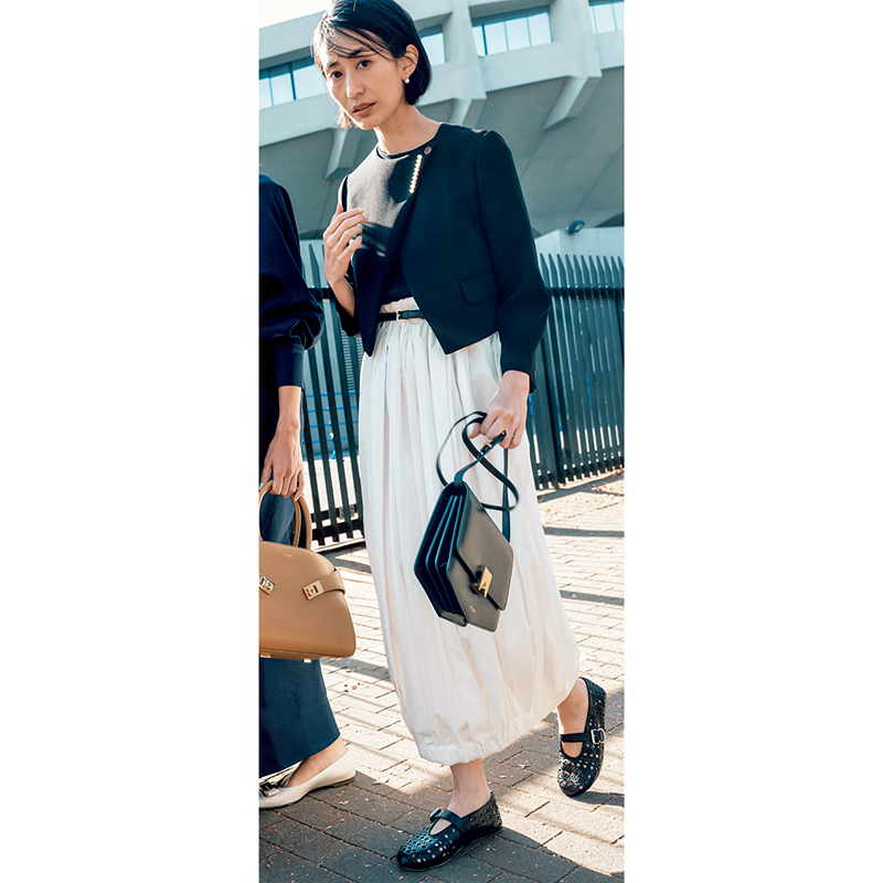 モード派が注目するのが、変形ジャケット。オーバーサイズには振らずにアシメやショート丈で、フォーマル感・品の良さはそのまま更新感を。着こなしの「顔」になるベルト使いも特徴。小物は、甘モードの代表格・アライアの小物で可愛げを取り入れて。