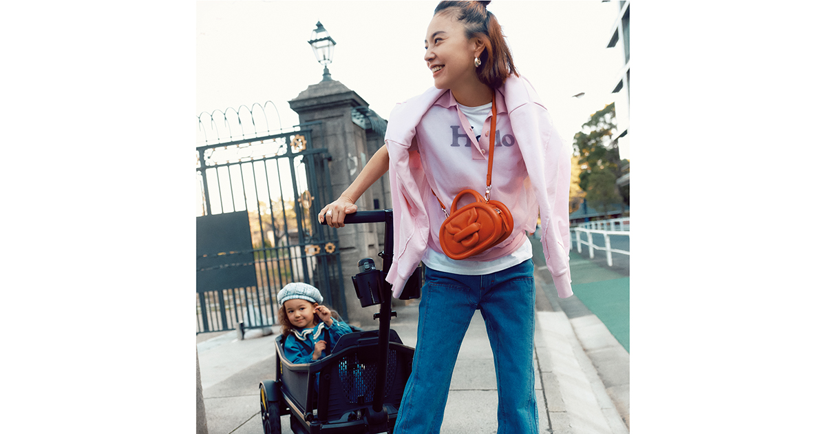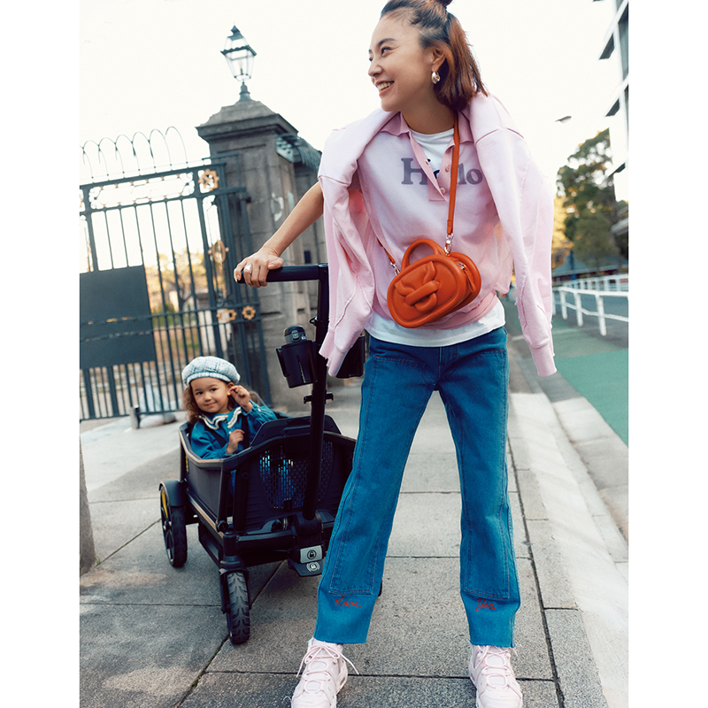 Tシャツ¥26,400 シアーポロニット¥71,500(ともにマディソンブルー)肩掛けスウェット¥19,800(プランクプロジェクト/プランクプロジェクト 青山店)デニム¥64,900(カーリーン/RHC ロンハーマン)バッグ¥151,800(ピエール アルディ/ピエール アルディ 東京)スニーカー¥21,230(ナイキ スポーツウェア/NIKE カスタマーサービス)ピアス¥59,400 リング¥55,000(ともにコールムーン/ショールーム セッション)ヴィア・クルーザーセット¥79,200(エアバギー)【女の子】すべてスタイリスト私物