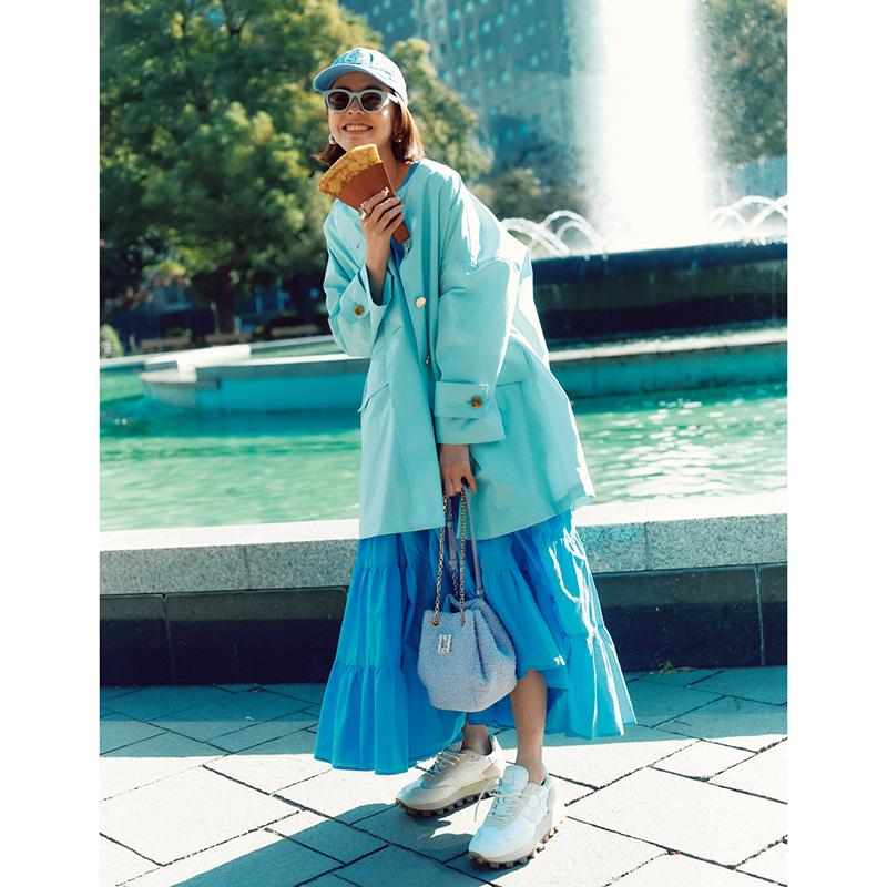 アウター¥107,800(マッキントッシュ/マッキントッシュ ギンザシックス店)ワンピース¥75,900(マーレット/ロンハーマン)キャップ¥7,480(シー/エスストア)バッグ¥284,900(ロジェ ヴィヴィエ/ロジェ・ヴィヴィエ・ジャパン)スニーカー¥113,300(トッズ/トッズ・ジャパン)サングラス¥29,700(ブラン/ライト)リング¥59,400 ピアス¥41,800(ともにトムウッド/トムウッド プロジェクト)