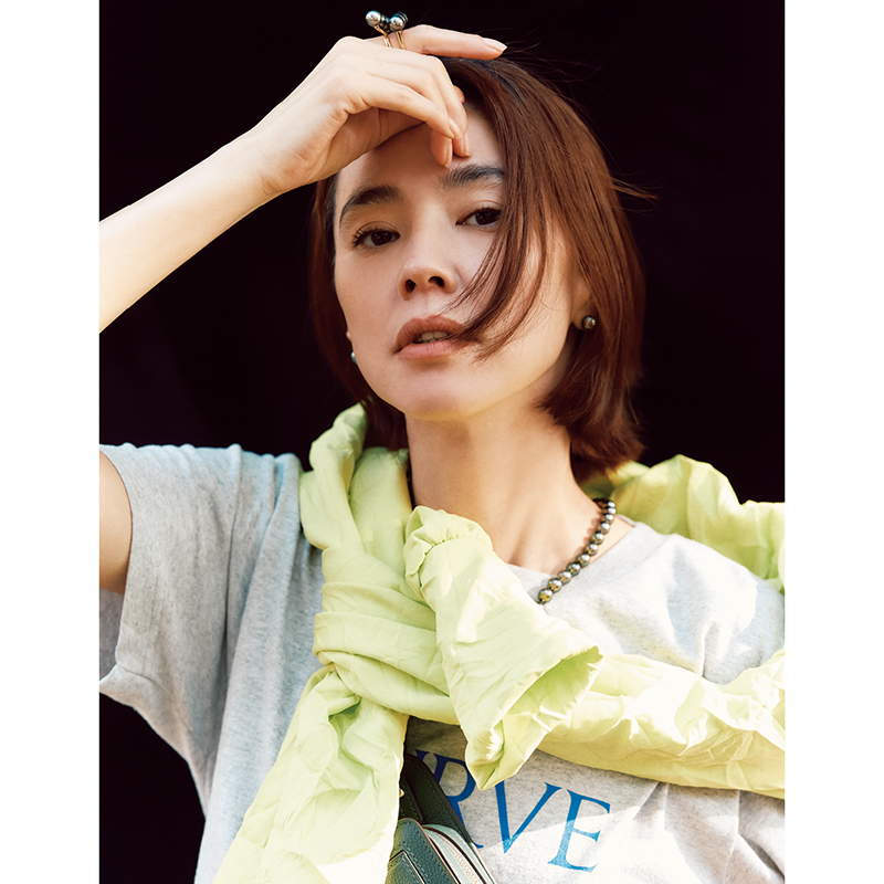 Tシャツ¥9,900 肩に巻いたフーディ¥26,400(ともにプランクプロジェクト/プランクプロジェクト 青山店)リング[指先側]¥434,500[付け根側]¥642,400 ピアス¥326,700 ネックレス¥1,661,000(すべてTASAKI) その他/スタイリスト私物