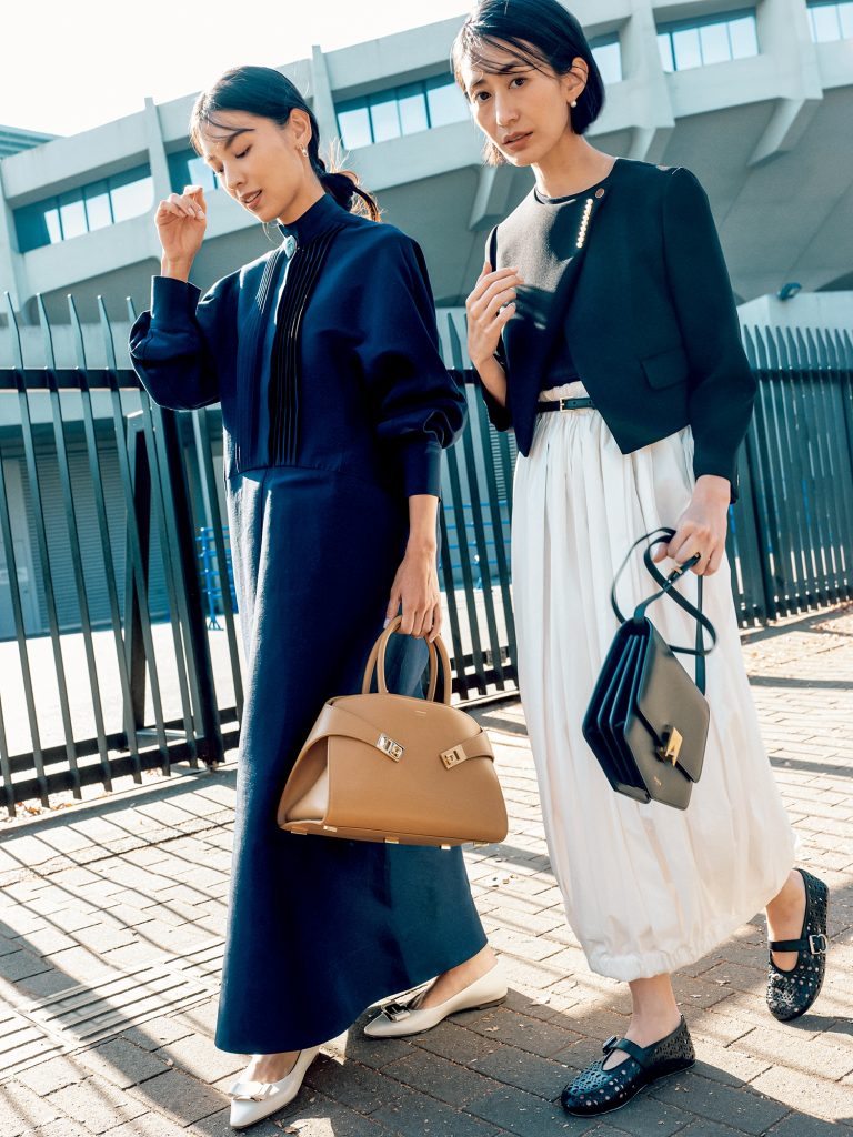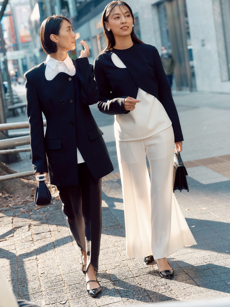 左・注目の韓国ブランドRECTO(レクト)のジャケットは、変わった形のネックが他にない存在感。体を美しく見せる細身シルエットも韓国らしく、いつもの黒パンツがブラッシュアップ。シャツはmtmodelist(エムティーモデリスト)、パンツはMW(エムダブリュ―)、バッグはセルジオロッシ、パンプスはジャンヴィト ロッシ。
