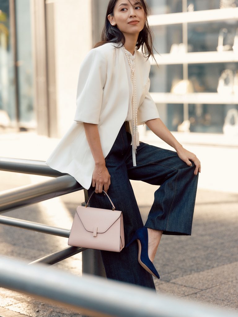 白ジャケットの爽やかさ、上品さはピカイチ。アキラナカの5分袖ジャケットならサラッと着られ、それだけでセレモニー感がUP。ブラウスはボールジィ、パンツはトリーバーチ、バッグはヴァレクストラ。