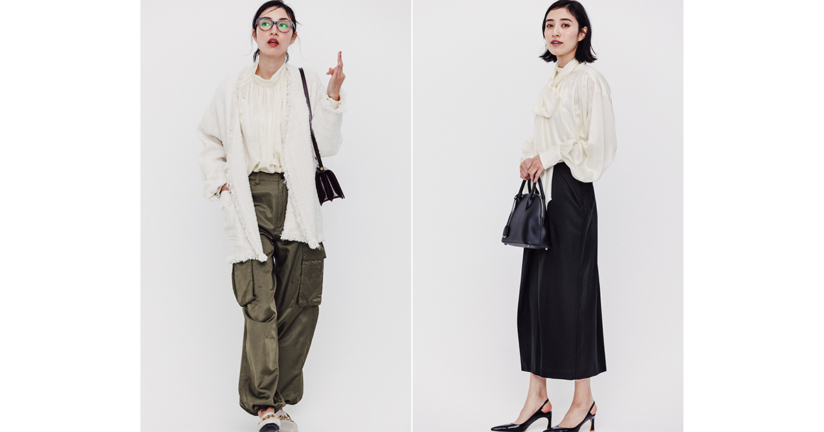 ブラウス¥49,500(デパリエ/デパリエ ニュウマン新宿店)スカート¥47,300(エステータ/オンワード樫山 お客様相談室)バッグ¥132,000(ボナベンチュラ)パンプス¥35,200(ピッピシック/ベイジュ)