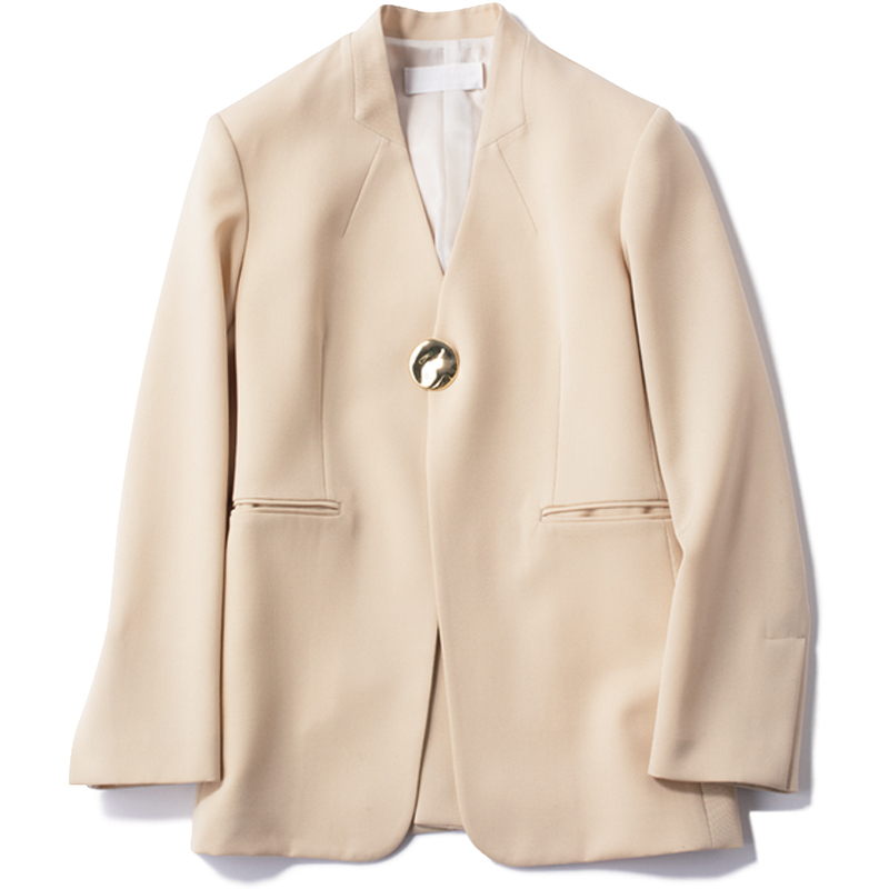 付属のメタルブローチは衿元につけてもOK。抜け感のある卵色なら尖りすぎず、デニムとも好相性でその後の着回し力にも期待。