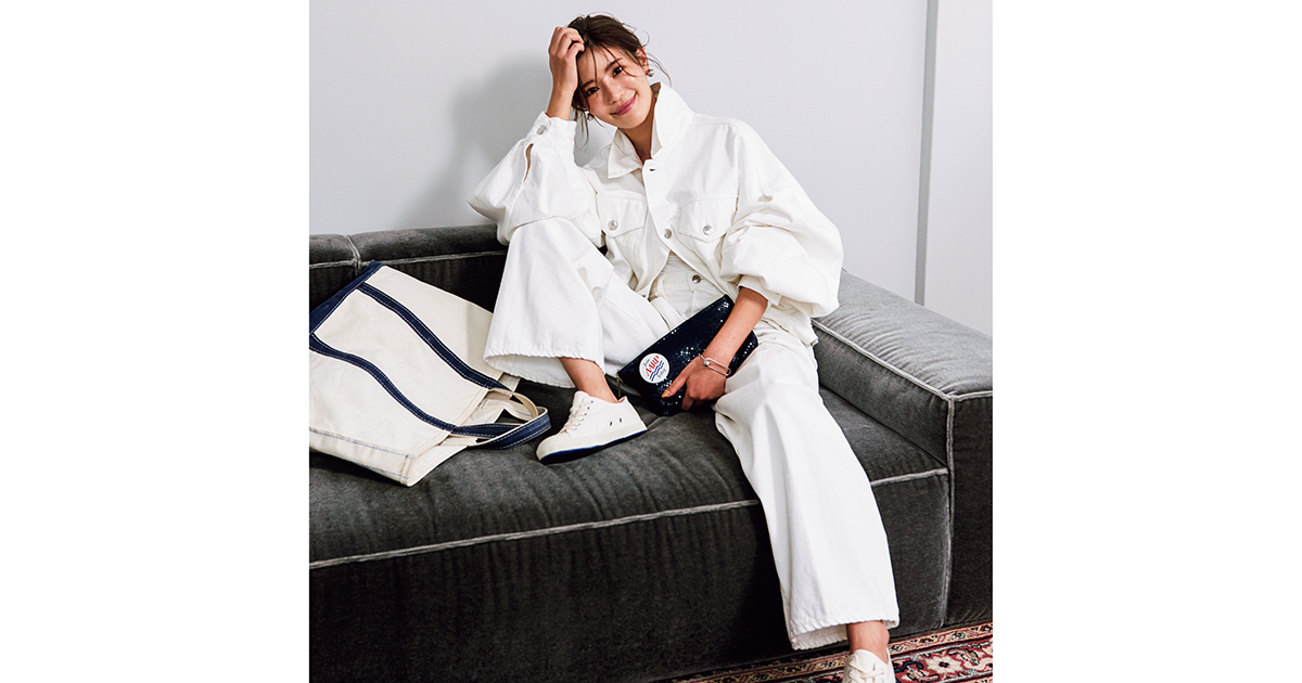ワイドデニムパンツ¥35,200[品番:13275/品名:TWILL WIDE-LEG PANTS]デニムジャケット¥44,000 ピアス¥19,800 バングル¥36,300(すべてハイク/ボウルズ)トートバッグ¥37,800 クラッチバッグ¥5,800 クラッチバッグにつけたバッジ¥500(すべてLong Beach OMOTESANDO)スニーカー¥9,350(ムーンスター/ムーンスター カスタマーセンター)