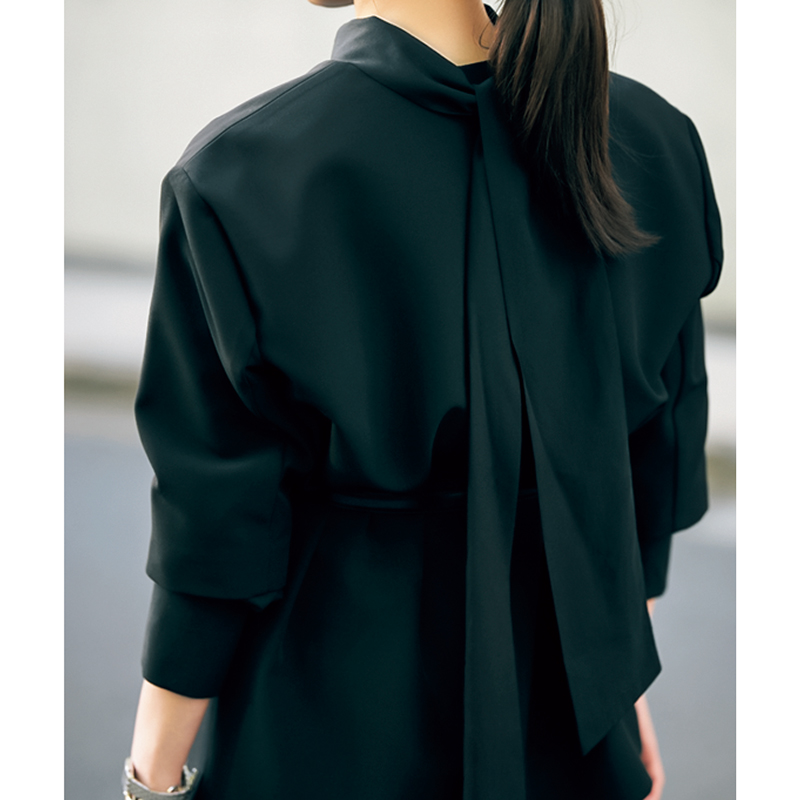 1歳入園なので大げさなセレモニー感は求めず、赤ちゃん連れでも無理のない服に。最適なのが、半袖ジャケット。お世話になる先生方に向けた、きちんと感は保ちつつ抱っこもしやすい。ボウタイも邪魔にならない背中側に流して、後ろ姿のアクセントに。ベルトや靴など、小物でオシャレ心を満たしたいですね。