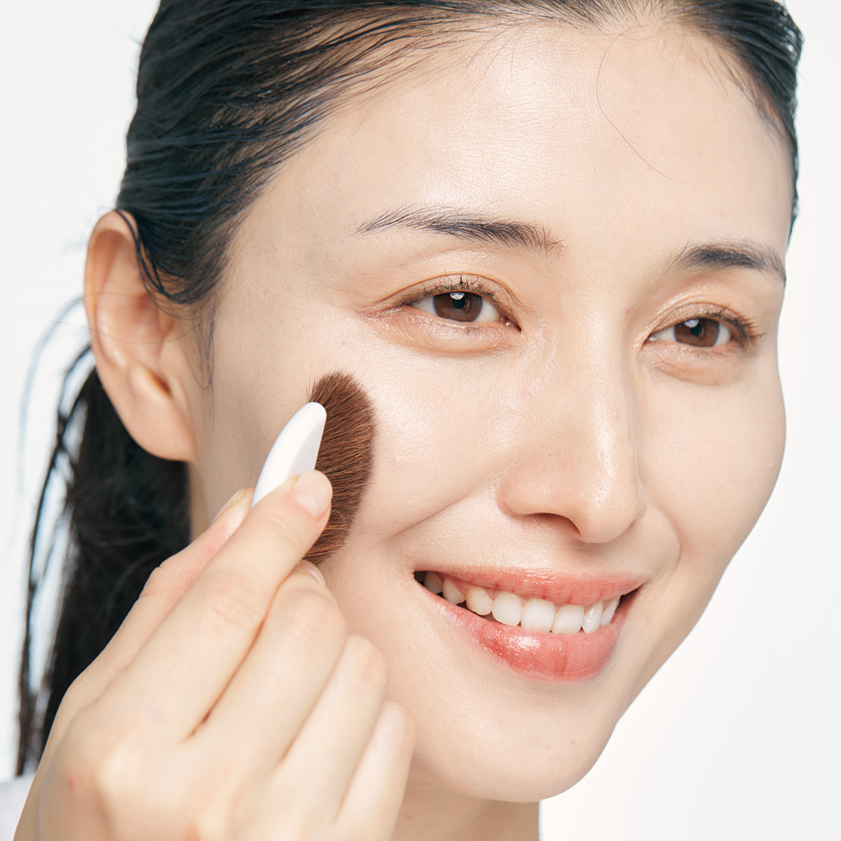 パウダリーファンデを極薄めに塗布。毛量の多いブラシを垂直に当て、ふわふわと軽く叩くように塗ります。