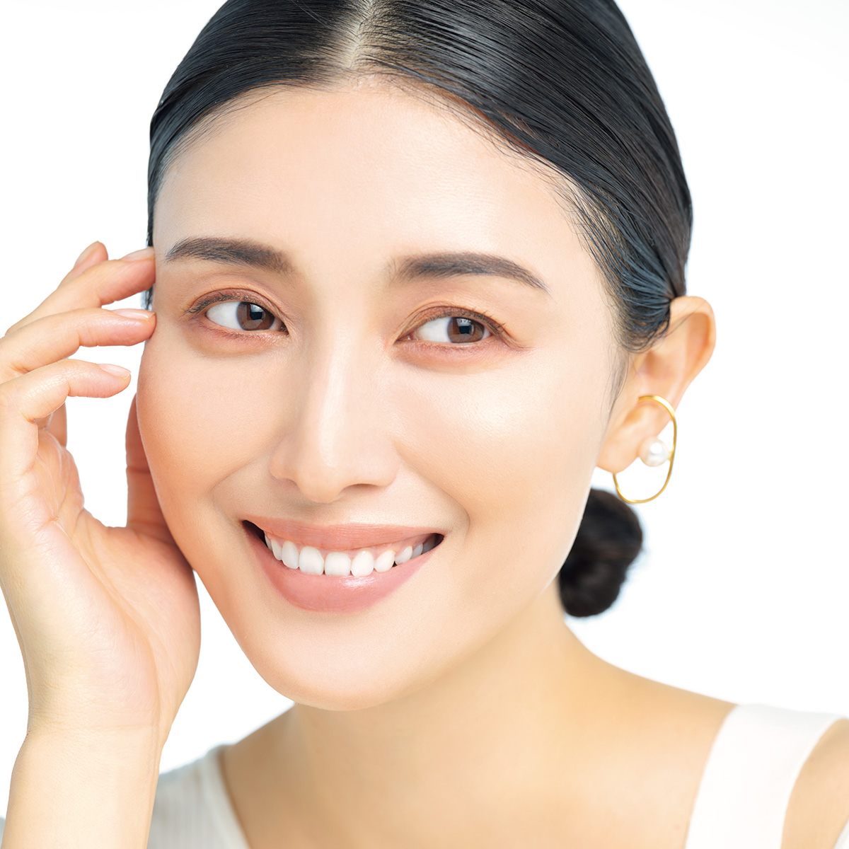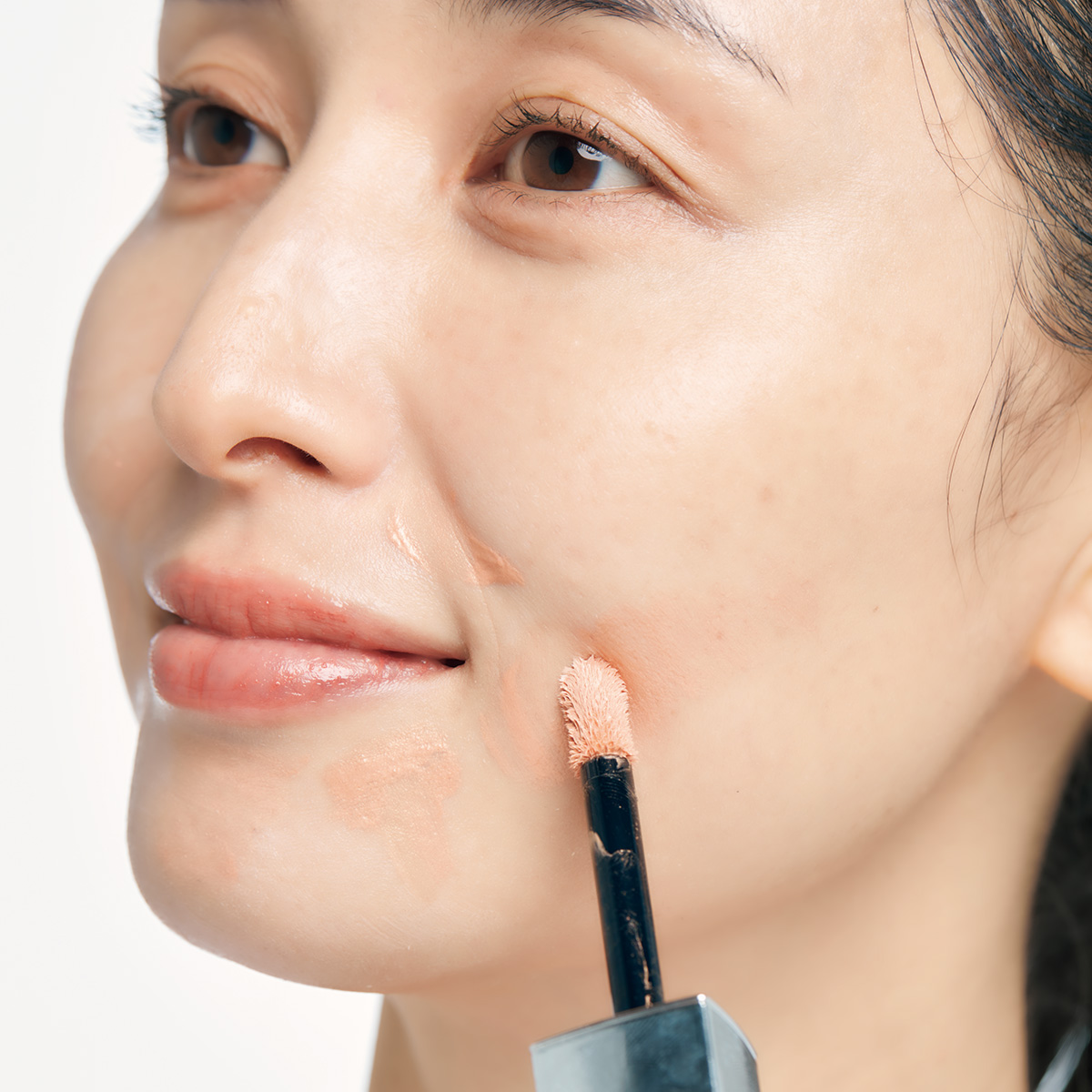 皮膚が薄いのによく動かす口周りは、肌不調が現れやすいパーツ。パールベースのゴールドハイライターで光を足してクリアに整えて。