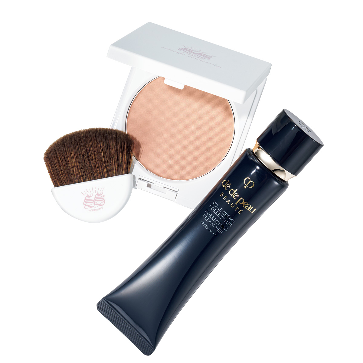 左:テクスチャーと肌へのやさしさにこだわるパウダリーファンデ。天然由来成分100% 配合。石鹸オフ可。付属のブラシも優秀。SS by WHOMEE ソソ パウダリーファンデーション 全3色 SPF24・PA+++ ¥3,740(Nuzzle)右:肌表面の凹凸や小ジワ、くすみを瞬時にカモフラ。独自成分スキンイルミネーター配合。ヴォワールコレクチュールn SPF25・PA++ 40g¥7,150(クレ・ド・ポー ボーテ)