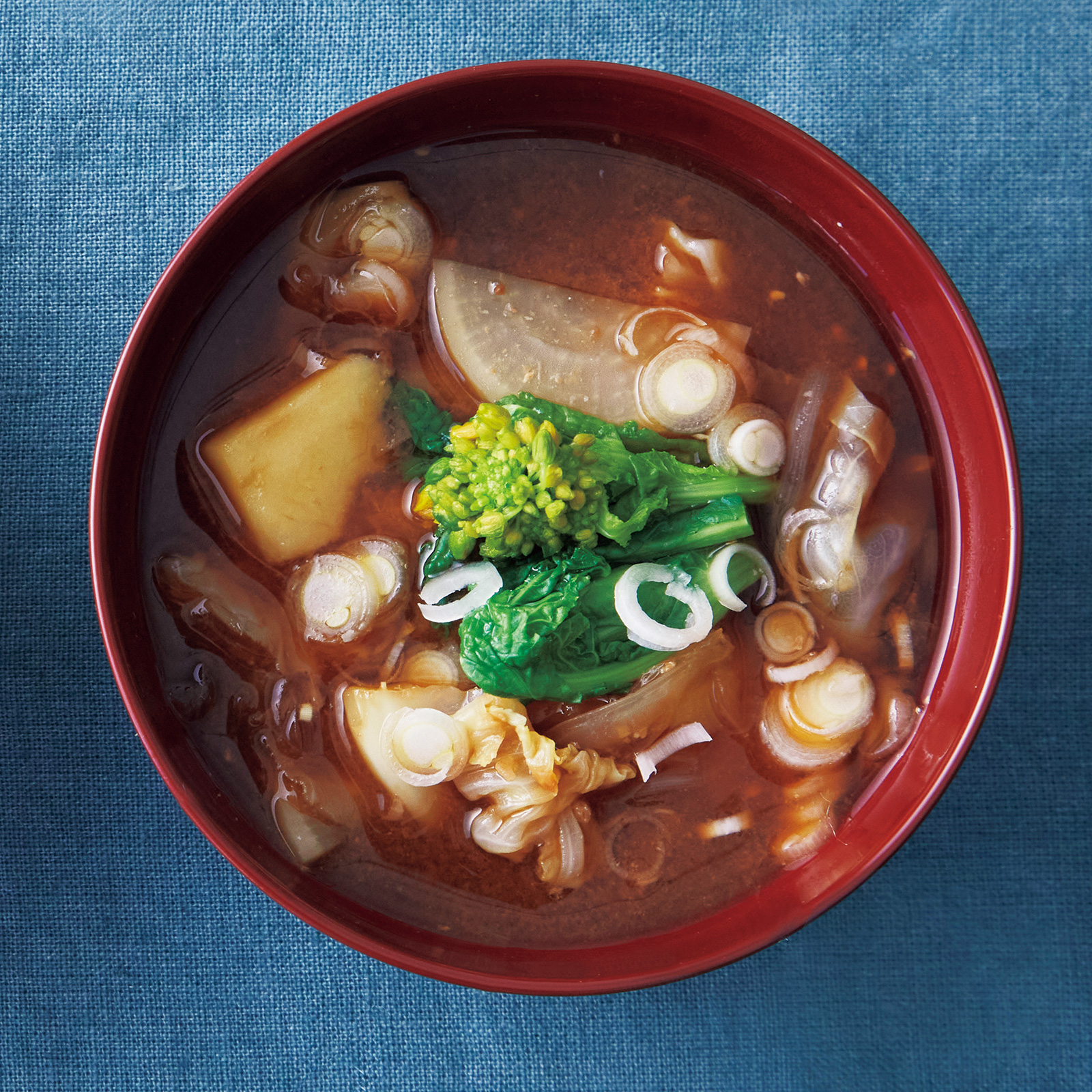 じゃがいも…1個、キャベツ…1枚、玉ねぎ…1/4個、菜の花…1本、ねぎ…1本だし汁…400ml、味噌…大さじ2