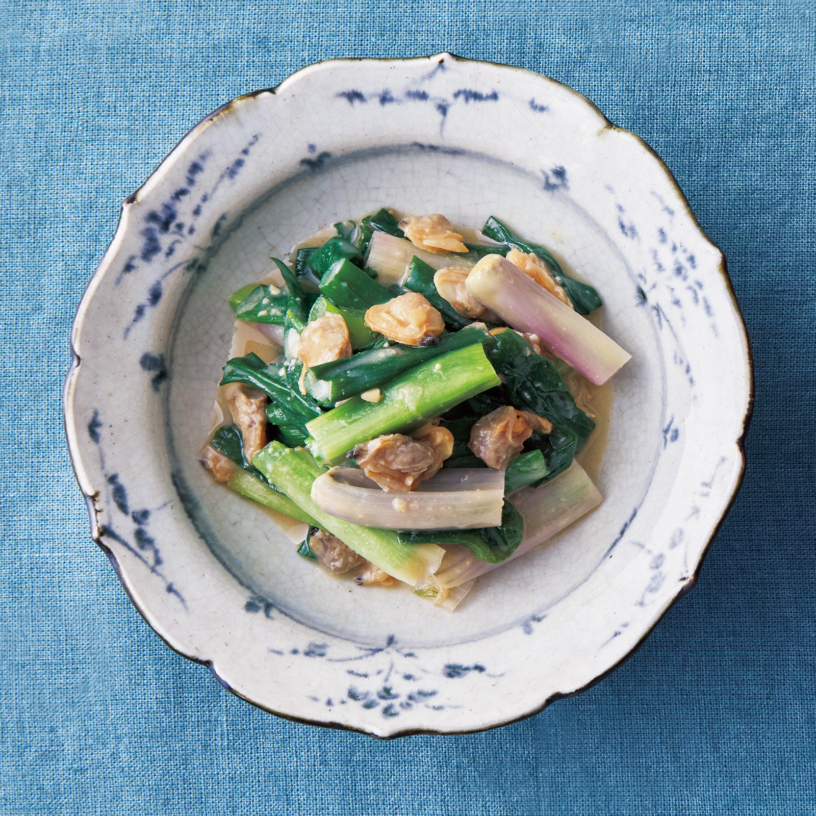 1.わけぎはさっと茹でてざるにあげ、まな板の上において根元から麺棒などを軽く転がしてぬめりと水分をしごいて4cmの長さに切る。あさりはこすり洗いしてざるにあげて水けを切る。