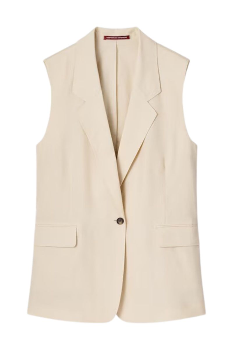「かっちりしすぎるジャケットが苦手なのですが、100%天然素材のリネンブレンドのセットアップなら柔らかな印象に。首元からフロントボタンにかけての下衿が長く、首を長くすっきり見せてくれます。ツータック入りのバナナシルエットのパンツは、ゆったりながら足首にかけてテーパードされ、カジュアルにもキレイめにも。インナーには顔周りが華やかに見えるコットンフリルシャツを合わせました。ハレの日後は、白Tとスニーカー合わせでカジュアルダウンさせるのが楽しみになるセットアップ。ノースリーブのジレだから、その後の着回し力も期待大」