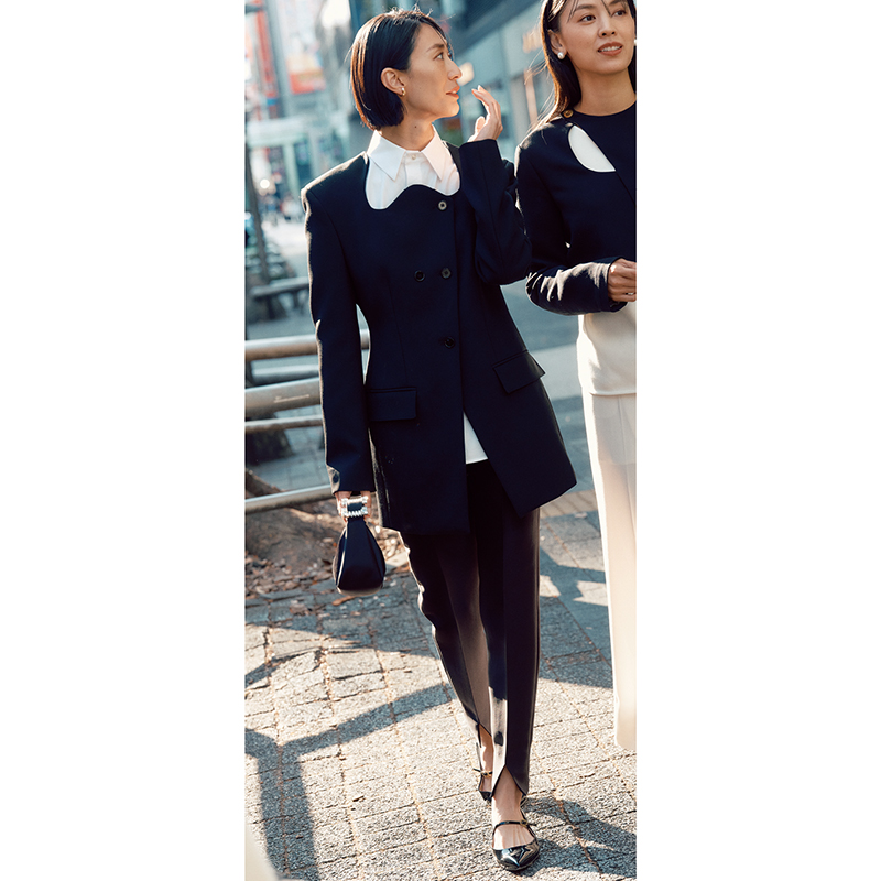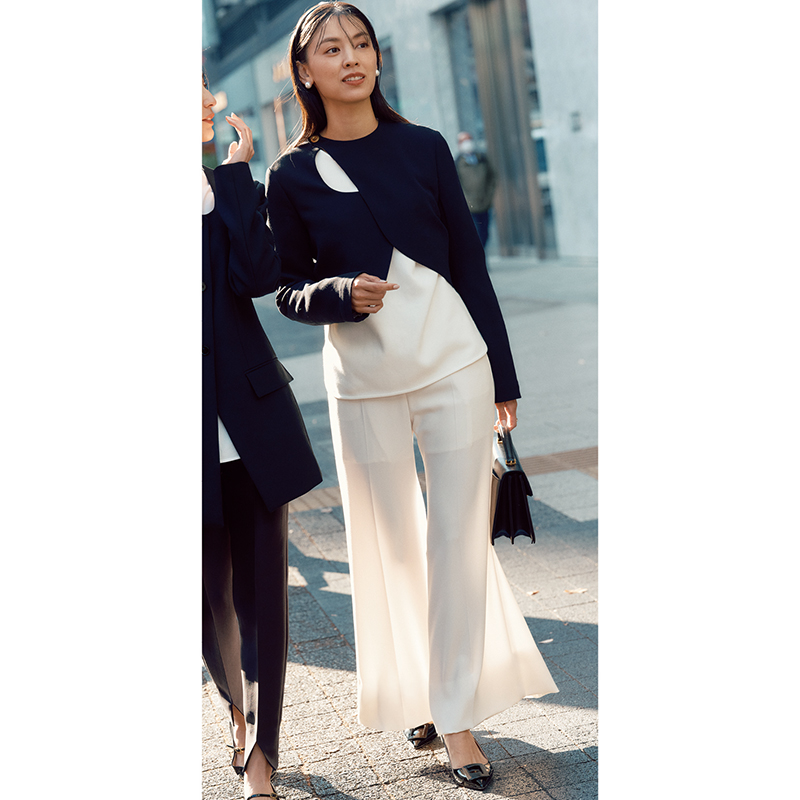 ジャケット¥99,000(バウト/ボウト)トップス¥8,800(ジャーナル スタンダード レリューム/ジャーナル スタンダード レリューム ルミネ新宿店)パンツ¥49,500(AKIRANAKA/ハルミ ショールーム)ピアス¥1,980,000 リング¥376,200(ともにTASAKI)カチューシャ¥6,050(イリス 47/フーブス)バッグ¥385,000(ロウナー ロンドン/エイチ アイ ティー)パンプス¥124,300(ロジェ ヴィヴィエ/ロジェ・ヴィヴィエ・ジャパン)