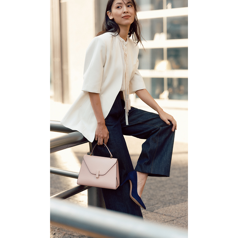 ジャケット¥86,900(AKIRANAKA/ハルミ ショールーム)ボウタイブラウス¥17,600(ボールジィ/トゥモローランド)デニムパンツ¥55,000(トリー バーチ/トリー バーチ ジャパン)ピアス¥132,000(カドー/カドー六本木ヒルズ店)パールタッセルネックレス¥66,000(ビジュードエム)バッグ¥588,500(ヴァレクストラ/ヴァレクストラ ジャパン)パンプス¥104,500(ジャンヴィト ロッシ/ジャンヴィト ロッシ ジャパン)