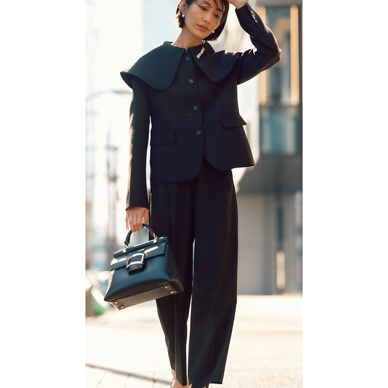ビッグカラージャケット¥100,467(ARCHTHE/ムシンサ グローバル ストア)タックパンツ¥33,000 ブローチ¥6,600(ともにユナイテッドアローズ/ユナイテッドアローズ 六本木ヒルズ店)ピアス¥39,600(カドー/カドー六本木ヒルズ店)バッグ¥383,900(ロジェ ヴィヴィエ/ロジェ・ヴィヴィエ・ジャパン)